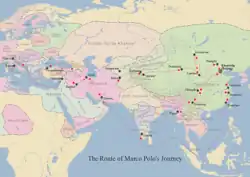His father, Niccolò Polo, a merchant, traded with the Near East, becoming wealthy and achieving great prestige.[30][31] Niccolò and his brother Maffeo set off on a trading voyage before Marco's birth.[31][32] In 1260,[33] Niccolò and Maffeo, while residing in Constantinople, then the capital of the Latin Empire, foresaw a political change; they liquidated their assets into jewels and moved away.[30] According to The Travels of Marco Polo, they passed through much of Asia, and met with Kublai Khan, a Mongol ruler and founder of the Yuan dynasty.[34]