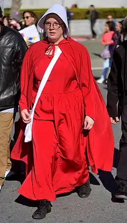In her dystopian novel The Handmaid's Tale (1985), all the developments take place near Boston in the United States, now known as Gilead, while Canada is portrayed as the only hope for an escape. To some this reflects her status of being "in the vanguard of Canadian anti-Americanism of the 1960s and 1970s".[123] Critics have seen the mistreated Handmaid as Canada.[124] During the debate in 1987 over a free-trade agreement between Canada and the United States, Atwood spoke out against the deal and wrote an essay opposing it.[125] She said that the 2016 United States presidential election led to an increase in sales of The Handmaid's Tale.[126] Amazon reported that The Handmaid's Tale was the most-read book of 2017.[127] The Handmaid's Tale sequel, The Testaments, also saw a rapid increase of sales immediately following the 2024 United States presidential election, with The Handmaid's Tale reaching third in Amazon's bestseller's list. Following this election, Atwood wrote on X, "Despair is not an option. It helps no one."[128][129]