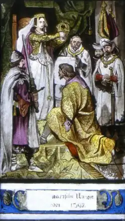 It had been understood that Margaret should, at the first convenient opportunity, provide the three kingdoms with a king who was to be a kinsman of all the three old dynasties, although in Norway it was specified that she would continue ruling alongside the new king, while in Sweden, the nobles assured Margaret that they were content to do without a king throughout her lifetime, which they hoped would be long.[35] In 1389 she proclaimed her great-nephew, Bogislav, who changed his name to Erik of Pomerania (grandson of Henry of Mecklenburg), king of Norway, having adopted him and his sister Catherine. In 1396, homage was rendered to him in Denmark and Sweden, while Margaret once again assumed the regency during his minority.