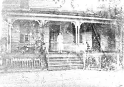 Photo of a young woman (likely Mitchell) on the front porch of Rural Home, circa 1920