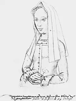 By her marriage contract, Margaret was allowed a household with 24 English courtiers or servants.[25] These included her cook Hunt, her chamberer Margaret, John Camner who played the lute, her ushers Hamnet Clegg and Edmund Livesay, and her ladies in waiting, Margaret Dennet, Eleanor Johns, Eleanor Verney, Agnes Musgrave, and Elizabeth Berlay.[26] Some of her ladies in waiting had been members of the household of Elizabeth of York.[27] Richard Justice and Harry Roper worked in the wardrobe, making her sheets, washing clothes, mending her tapestries and perfuming them with violet powder. Roper had been Page of the Beds to Elizabeth of York, and Justice was her Page of Robes. Roper returned to England to serve Catherine of Aragon.[28][29] Elizabeth Maxtoun, a Scottish woman, washed the queen's linen. Rich fabrics were provided by an Italian merchant Jerome Frescobaldi.[30] After a few years, she employed a Scottish cook Alexander Kerse.[31] Some members of her household were described in a humorous poem by William Dunbar, Ane Dance in the Quenis Chalmer.[32]