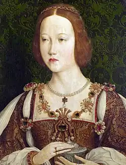 She escaped to Tantallon Castle and then, via Blackadder Castle and Coldstream Priory, crossed the border to England.[49] She left valuable costume and jewels behind at Tantallon, including several velvet hoods embroidered with pearls with jewel-set front borders called "chaffrons", and a silk hat with a diamond jewel that had been a present from Louis XII of France.[50][51][52] Her jewels were later collected by Thomas Dacre's agent, John Whelpdale, the Master of College of Greystoke.[53][54]
