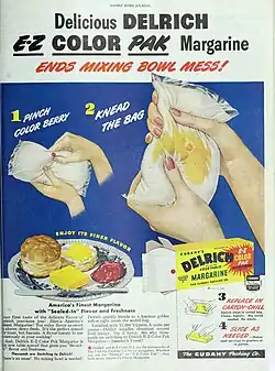 Dairy firms, especially in Wisconsin, became alarmed at the potential threat to their business, and succeeded in getting legislation passed to prohibit the coloring of the stark white margarine by 1902. In response, margarine companies distributed margarine together with a packet of yellow food coloring.[2] The product was placed in a bowl and the coloring mixed in manually, taking some time and effort, especially if the mixing needed to be done by hand—typically the case at the time since domestic electric mixers were rarely used before the 1920s. It was therefore not unusual for the final product to be served as a light and dark yellow, or even white, striped product. During World War II, butter and margarine were both in short supply and subject to rationing in the United States, but butter required more points, causing margarine to gain popularity.[2][20] In 1951, the W. E. Dennison Company received US Patent 2553513[21] for a method to place a capsule of yellow dye inside a plastic package of margarine. After purchase, the capsule was broken by pressing on the outside of the package, and the package was kneaded to distribute the dye.
