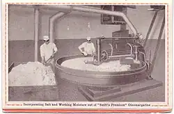 The principal raw material in the original formulation of margarine was beef-fat.[2] In 1871, Henry W. Bradley of Binghamton, New York, received US Patent 110626[15] for a process of creating margarine that combined vegetable oils (primarily cottonseed oil) with animal fats.[16][17] In 1874, the first commercial cargo arrived in the UK.[18] By the late-19th century, some 37 companies were manufacturing margarine in the US, in opposition to the butter industry, which protested and lobbied for government intervention, eventually leading to the 1886 Margarine Act imposing prohibitive taxes and fees against margarine manufacturers.[2]