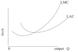 The long run is defined as the length of time in which no input is fixed. Everything, including building size and machinery, can be chosen optimally for the quantity of output that is desired. As a result, even if short-run marginal cost rises because of capacity constraints, long-run marginal cost can be constant. Or, there may be increasing or decreasing returns to scale if technological or management productivity changes with the quantity. Or, there may be both, as in the diagram at the right, in which the marginal cost first falls (increasing returns to scale) and then rises (decreasing returns to scale).[3]