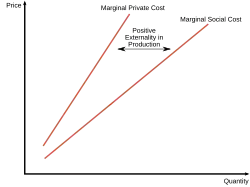 When the marginal social cost of production is less than that of the private cost function, there is a positive externality of production. Production of public goods is a textbook example of production that creates positive externalities. An example of such a public good, which creates a divergence in social and private costs, is the production of education. It is often seen that education is a positive for any whole society, as well as a positive for those directly involved in the market.