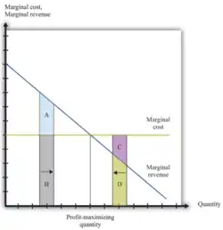On the other hand, the right side of the black line (Marginal revenue = marginal cost), shows that marginal cost is more than marginal revenue. Suppose a firm sets its output on this side, if it reduces the output, the cost will decrease from C and D which exceeds the decrease in revenue which is D. Therefore, decreasing output until the point of (marginal revenue=marginal cost) will lead to an increase in profit (Theory and Applications of Microeconomics, 2012).