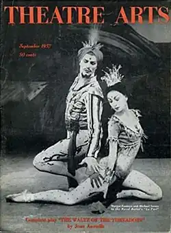 Ashton immediately created Symphonic Variations to capitalize on the success of the opening.[2] Of the six dancers in the production, Fonteyn's performance was dubbed "brilliant" and Moira Shearer was singled out for her elegance.[45] When the American Ballet Theatre visited the Royal Opera House in 1946, Fonteyn became a close friend of the New York dancer Nora Kaye.[46] Fonteyn appeared on television in 1946, to mark the re-opening of Alexandra Palace after the War.[47] Her television appearances were followed by a performance with the choreographer Léonide Massine as the miller's wife in his The Three-Cornered Hat and as the lead in the abstract debut of Scènes de ballet which Ashton wrote for her.[2][6]