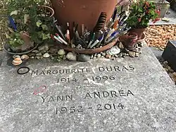 - ^ "Pens, pencils and some feathers - tributes to Marguerite Duras around the potted tree on her grave". 31 July 2018. Retrieved 25 June 2024 – via Flickr.
