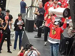 After missing the first 22 games of the 2009–10 season, Hossa made his debut for the Blackhawks on 25 November 2009, against the San Jose Sharks, scoring twice, including a short-handed goal in the second period of the game.[36] On 13 February 2010, Hossa suffered a concussion in a 5–4 shootout win over his former team, the Atlanta Thrashers as he took a blow to the head from Thrashers' winger Colby Armstrong, resulting in him missing the next game the next day against the Columbus Blue Jackets, where the Blackhawks clinched another 5–4 shootout win.[37] The season was then paused for the next three weeks for the Olympics and Hossa recovered in time to compete in the 2010 Winter Olympic Games. During the Blackhawks' first playoff series in 2010, Hossa received a five-minute major penalty for boarding Nashville Predators defenceman Dan Hamhuis. With 13.6 seconds left in regulation, Hossa's teammate Patrick Kane tied the game. In the ensuing overtime, Hossa scored the game-winning goal on Predators goaltender Pekka Rinne seconds after exiting the penalty box. Since Hamhuis was not injured, the NHL did not fine or suspend Hossa. On 23 May 2010, the Chicago Blackhawks swept the top seeded San Jose Sharks to earn a trip to the 2010 Stanley Cup Finals, sending Hossa to the Final for the third-straight year with his third different team, a first in the NHL.[38] Fans and the media had dubbed Hossa's inability to win the Stanley Cup while going to the finals the "Hossa Curse" or the "Hossa Hex." According to Hossa's agent, Ritch Winter, Hossa's third consecutive year in the Stanley Cup Finals was no coincidence, with Winter stating that they had used a mathematical model to determine the teams most likely to get at least 100 points in the 2009–10 regular season.[39] On 9 June 2010, Hossa finally lifted his first Stanley Cup after the Blackhawks defeated the Philadelphia Flyers in six games. Chicago captain Jonathan Toews handed the Cup to Hossa first during the team pass-around.[40] Hossa was the first player in NHL history to go to the Finals in three consecutive seasons with three different teams, a feat that would subsequently be repeated by Corey Perry in 2020, 2021 and 2022.[41]
