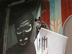 Manson began his long-term collaboration with Austrian-Irish artist Gottfried Helnwein, working together on several multi-media projects associated with the album, including the exhibitions and installation art projects featured at the album's launch party at The Key Club in Los Angeles, the album artwork, the music video to lead single "mOBSCENE", as well as the artwork which accompanied Manson's essay for The Rock and Roll Hall of Fame and Museum.[106][107] Limited edition copies of the album included a DVD titled Doppelherz (Double-heart), a 25-minute surrealist short film directed by Manson which featured art direction by Helnwein.[108] Another world tour followed, "Grotesk Burlesk", which furthered the album's Weimar Republic-inspired theme by adding Helnwein-created stage dressing and elements of German Kabarett to the group's performances.[107] Manson and the band members began appearing both on-and off-stage in designer suits created by Jean-Paul Gaultier.[109]