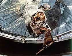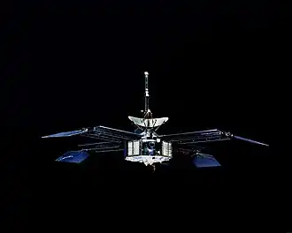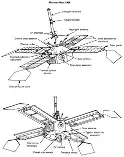 Mariner 4 (Mariner C-3, together with Mariner 3 known as Mariner-Mars 1964) was the fourth in a series of spacecraft intended for planetary exploration in a flyby mode. It was designed to conduct closeup scientific observations of Mars and to transmit these observations to Earth. Launched on November 28, 1964,[2] Mariner 4 performed the first successful flyby of the planet Mars, returning the first close-up pictures of the Martian surface. It captured the first images of another planet ever returned from deep space; their depiction of a cratered, dead planet largely changed the scientific community's view of life on Mars.[3][4] Other mission objectives were to perform field and particle measurements in interplanetary space in the vicinity of Mars and to provide experience in and knowledge of the engineering capabilities for interplanetary flights of long duration. Initially expected to remain in space for eight months, Mariner 4's mission lasted about three years in solar orbit.[5] On December 21, 1967, communications with Mariner 4 were terminated.