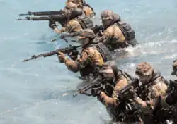 Marine units primarily deploy from warships using boats, landing craft, hovercraft, amphibious vehicles or helicopters. Specialist units are also trained in combat diving/combat swimming and parachuting.