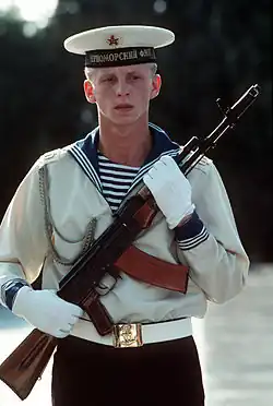 Soviet naval infantryman during a U.S. naval visit to a Soviet port in 1989
