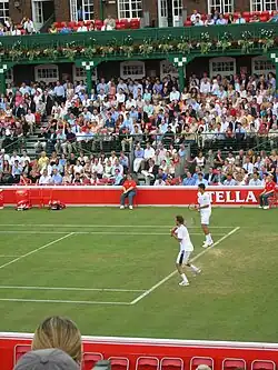Goran Ivanišević and Mario Ančić playing doubles during the 2004 Queen's Club Championships
