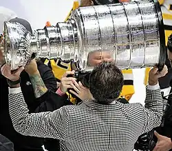 Drafted first overall by the Penguins in the 1984 NHL Entry Draft,[4] Lemieux led Pittsburgh to consecutive Stanley Cup championships in 1991 and 1992. Under his ownership, the Penguins won additional titles in 2009, 2016, and 2017. He is the only man to have his name on the Cup both as a player and owner.[5] He also led Team Canada to an Olympic gold medal in 2002,[6] a championship at the 2004 World Cup of Hockey, and a Canada Cup in 1987. He won the Lester B. Pearson Award as the most outstanding player voted by the players four times, the Hart Trophy as the NHL's most valuable player (MVP) during the regular season three times, the Art Ross Trophy as the league's points leader six times, and the Conn Smythe Trophy as playoffs MVP in 1991 and 1992. He is the only player to score a goal in each of the five possible situations in a single NHL game, a feat he accomplished in 1988. At the time of his retirement, he was the NHL's seventh-highest career points scorer with 690 goals and 1,033 assists.[7] He ranks second in NHL history with a 0.754 career goals-per-game average, behind Mike Bossy (0.762).[8] He ranks second in NHL history with a 1.129 career assists-per-game average and a 1.883 points-per-game average, both behind Wayne Gretzky (1.320 and 1.921, respectively).