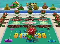 Mario Power Tennis includes variations of tennis matches consisting of characters, courts, and scenarios based on the Mario series. The range of courts includes the standard three types of tennis court, but consists predominantly of those themed upon games in the Mario series, known as "Gimmick" courts. As well as adopting the style aesthetically, these feature thematic elements that influence how the match will be played on that surface, such as the ghosts in the Luigi's Mansion court, which hinder movement when the character comes into physical contact with them.[2] Although standard tennis is available, variants of the sport can be played which adopt different rules and methods of victory. "Ring Shot" involves the player earning points by hitting the ball through rings of varying sizes, with the number of points dependent on the difficulty of the shot.[3] The player acquires the points whenever a winning shot is made adhering to standard rules; the match is won once the predetermined number of points is equaled or surpassed. A similar mode, "Item Battle", involves the characters using items based on the Mario universe to interfere with each other's game and gain an advantage.[4] The central mode of the game is "Tournament Mode", which comprises a set of events with accumulating difficulty. This set of events must be finished successfully to unlock playable characters. This mode can be completed either in "doubles" or "singles", and is divided into Gimmick courts and standard courts.[5] An alternative to these are "Special Games", which involve the player trying to meet a tennis-related objective on a Gimmick court. These Special Games come in multiple forms, incorporating themes from past Nintendo games, such as "Tic-Tac-Glow", which requires the player to hit balls of water to liberate Shine Sprites trapped in dirt,[6] a reference to Super Mario Sunshine. Power Tennis supports the option for four-player multiplayer, which can be accessed during "Exhibition Mode",[5] the standard mode of play where the player can choose his or her opponents and the conditions of the match. Such options include the difficulty of the opponent, the court used, and the number of games and sets required to win the match.