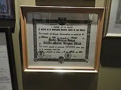 Vargas Llosa declared himself a music lover and stated that he felt a special fondness for Gustav Mahler.[161] He was fond of association football and was a supporter of Universitario de Deportes.[162] In his book A Fish in the Water he confessed that from childhood he was a fan of the 'cream coloured' team from Peru, which he first saw play one day in 1946 when he was only 10 years old.[163] In February 2011, Vargas Llosa was awarded an honorary life membership of this football club, in a ceremony that took place at Lima's Monumental Stadium.[164][165]