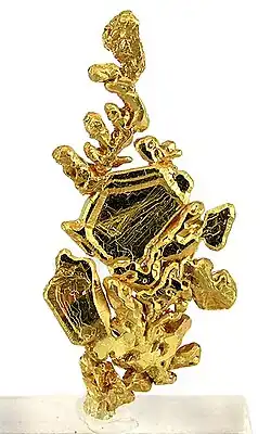 Two small gold mines in Mariposa County, the Mockingbird mine and the Colorado Quartz mine, intermittently produce world-class (and very expensive) specimens of crystalline gold for mineral collectors. "Specimens from these occurrences commonly have bright luster and rich color, with well-developed crystals in unusual and attractive arrangements."[9] The best-known example is "The Dragon", now on display at the Houston Museum of Natural Science.[10]