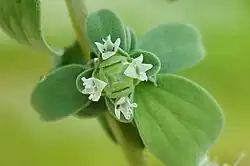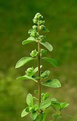 Leaves are smooth, simple, petiolated, ovate to oblong-ovate, 0.5–1.5 cm (0.2–0.6 inches) long, 0.2–0.8 cm (0.1–0.3 inches) wide, with obtuse apex, entire margin, symmetrical but tapering base, and reticulate venation. The texture of the leaf is extremely smooth due to the presence of numerous hairs.[13] Its flowers can be white, pink to red, or blue to purple.[14]