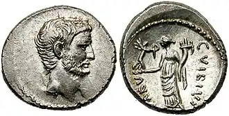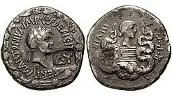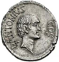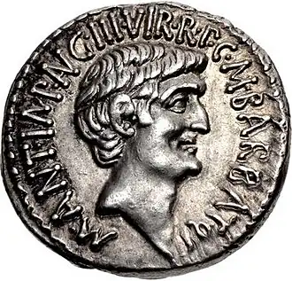 Denarius depicting Mark Antony minted by Marcus Barbatius. Legend: m(arcus) ant(onius) imp aug iiivir rpc m(arcus) barbatius q p[note 1]