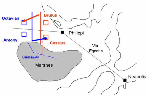 During the Greek campaign, Plutarch records that Antony was Caesar's top general, and second only to him in reputation.[39] Antony joined Caesar at the western Balkan Peninsula and besieged Pompey's larger army at Dyrrhachium. With food sources running low, Caesar, in July, ordered a nocturnal assault on Pompey's camp, but Pompey's larger forces pushed back the assault. Though an indecisive result, the victory was a tactical win for Pompey. Pompey, however, did not order a counterassault on Caesar's camp, allowing Caesar to retreat unhindered. Caesar would later remark the civil war would have ended that day if only Pompey had attacked him.[40] Caesar managed to retreat to Thessaly, with Pompey in pursuit.