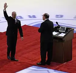 In February 2007, Messier publicly expressed interest in returning to the NHL as general manager for the Rangers; however, the then-current general manager Glen Sather responded by saying he had no plans of stepping down from his position.[53] With the departure of assistant general manager Don Maloney from the Rangers organization in May 2007, Messier's name had been attached to possible replacements;[54] however, in July 2007, Jim Schoenfeld was announced as Maloney's replacement. On November 12, 2007, Messier was inducted into the Hockey Hall of Fame in the players category.