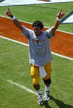 Sanchez entered spring practice after the 2008 season as the front-runner to take over the starting quarterback position, but faced strong competition from redshirt freshman Aaron Corp and Mitch Mustain, a transfer from Arkansas, where he had been the starting quarterback; Mustain, like Sanchez, was named the top quarterback in the nation upon the conclusion of high school career in 2006.[6][21] By the end of spring practice, Carroll announced Sanchez would be the starting quarterback heading into the fall.[22] During the first week of fall camp, Sanchez dislocated his left kneecap during warm-ups prior to practice; trainers immediately put the kneecap back into place.[23] After missing nearly three weeks, Sanchez was cleared to play in the opener against Virginia.[24] Prior to the opener, he was contacted by USC's previous three quarterbacks—Carson Palmer, Leinart, and Booty—who wished Sanchez well and offered general advice.[25]