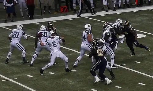 In the team's second meeting against the Bills on December 3, 2009, Sanchez suffered a sprained posterior cruciate ligament in the third quarter, prompting the veteran Clemens to take his place.[57] Though there were no setbacks to the injury, head coach Ryan benched Sanchez the following game against the Tampa Bay Buccaneers for precautionary reasons, much to Sanchez's dismay.[57] At 7–7, the Jets had a chance to secure a playoff berth if they won the remainder of their games.[58] One such game was against the Indianapolis Colts who had 23 consecutive regular season wins.[58] Sanchez and the Jets engineered a comeback win following Colts head coach Jim Caldwell's decision to controversially rest the team starters in the third quarter with a five-point lead.[58] The following week, on January 3, 2010, Sanchez led the team into the playoffs, despite a subpar effort, completing 8 of 16 passes for 63 yards, en route to a 37–0 victory over the Cincinnati Bengals, who rested their starters as the team had already clinched the AFC North division title and a playoff berth.[59] The manner of the two wins, which gave the Jets their first playoff berth since 2006, caused many to claim the team had "backed into the playoffs".[60] Sanchez completed his rookie season with 2,444 yards, 12 touchdowns, and 20 interceptions.[61]