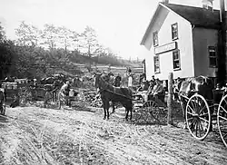 By 1857 most of the township had been cleared of timber and was under cultivation. Villages like Thornhill, Unionville and Markham greatly expanded.[31] In 1851 Markham Village "was a considerable village, containing between eight and nine hundred inhabitants, pleasantly situated on the Rouge River. It contains two grist mills ... a woollen factory, oatmeal mill, barley mill and distillery, foundry, two tanneries, brewery, etc., a temperance hall and four churches... ."[32] In 1871, with a township population of 8,152,[33] the Toronto and Nipissing Railway built the first rail line to Markham Village and Unionville, which is still used today by the GO Transit commuter services.