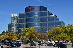 As of 2013, tertiary industry mainly drives Markham. As of 2010, "business services" employed the largest proportion of workers in Markham – nearly 22% of its labour force.[8] The city also has over 1,000[9] technology and life-sciences companies, with IBM as the city's largest employer.[10][11] Several multinational companies have their Canadian headquarters in Markham, including: Honda Canada, Hyundai,[12] Advanced Micro Devices,[13] Johnson & Johnson, General Motors, Avaya,[14] IBM,[15] Motorola,[16] Oracle,[17] Toshiba,[18] Toyota Financial Services,[19] Huawei, Honeywell, General Electric[20] and Scholastic Canada.[21]