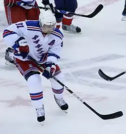 Näslund signed a two-year, $8 million contract, including a $1 million signing bonus, with the New York Rangers on 3 July 2008.[131] Upon signing, he revealed New York was his preferred destination heading into free agency.[131] He left Vancouver as the franchise's all-time leader in goals and points with 346 and 756, respectively.[132] His departure also ended his eight-year tenure as team captain, matching Stan Smyl's captaincy as the longest in franchise history.[133] General manager Mike Gillis, who formerly acted as Näslund's agent,[134] released a statement on behalf of the Canucks organization, commending him as "one of the greatest athletes to ever represent the Canucks both on and off of the ice".[131]
