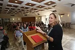 Matlin is actively involved with charitable organizations such as Easter Seals (where she was appointed an Honorary board member), the Children Affected by AIDS Foundation, Elizabeth Glaser Pediatric AIDS Foundation, VSA arts, and the Red Cross Celebrity Cabinet.[44] She has been a strong advocate for the rights of deaf people, accepting television roles only if producers commit to caption the films, remaining openminded and respectful of both signed and spoken communication preferences, and promoting telephone equipment specifically designed for deaf persons. She has testified before the Senate Committee on Labor and Human Resources in support of the establishment of the National Institute on Deafness and Communication Disorders. Matlin has also been active in the fight against AIDS, the "Victory Awards" for the National Rehabilitation Hospital, and other causes.[19] She is also a lifetime member of Hadassah Women's Zionist Organization of America.[45] Matlin has been a frequent guest narrator at Disney's Candlelight Processional at Walt Disney World.[46] Matlin received an honorary Doctorate of Humane Letters degree from Gallaudet University in 1987.[47][48][49] In 1988, Matlin received the Samuel S. Beard Award for Greatest Public Service by an Individual 35 Years or Under, an award given out annually by Jefferson Awards.[50][51] In 1991, Matlin received the Bernard Bragg Young Artists Achievement Award at the Annual International Creative Arts Festival sponsored by the Center on Deafness in Chicago.[19] Matlin was appointed by President Bill Clinton in 1994 as a member of the Board of Directors of the Corporation for National and Community Service and served as chair of National Volunteer Week.[52] Matlin was a participant in the first-ever national television advertising campaign supporting donations to Jewish federations. The program featured "film and television personalities celebrating their Jewish heritage and promoting charitable giving to the Jewish community" and included Greg Grunberg, Joshua Malina, Kevin Weisman, and Jonathan Silverman.[53]