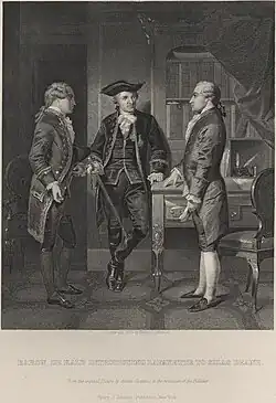 On his return, Lafayette found the American cause at a low ebb, rocked by several military defeats, especially in the south.[60] Lafayette was greeted in Boston with enthusiasm, seen as "a knight in shining armor from the chivalric past, come to save the nation".[61] He journeyed southwest and on 10 May 1780 had a joyous reunion with Washington at Morristown, New Jersey. The general and his officers were delighted to hear that the large French force promised to Lafayette would be coming to their aid.[62] Washington, aware of Lafayette's popularity, had him write (with Alexander Hamilton to correct his spelling) to state officials to urge them to provide more troops and provisions to the Continental Army.[63] This bore fruit in the coming months, as Lafayette awaited the arrival of the French fleet.[64] However, when the fleet arrived, there were fewer men and supplies than expected, and Rochambeau decided to wait for reinforcements before seeking battle with the British. This was unsatisfactory to Lafayette, who proposed grandiose schemes for the taking of New York City and other areas, and Rochambeau briefly refused to receive Lafayette until the young man apologized. Washington counseled the marquis to be patient.[65]