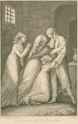 At this time, Jean-Paul-François de Noailles, Duc d'Ayen was looking to marry off some of his five daughters. The young Lafayette, aged 14, seemed a good match for his 12-year-old daughter, Adrienne de La Fayette, and the duke spoke to the boy's guardian (Lafayette's uncle, the new comte) to negotiate a deal.[12] However, the arranged marriage was opposed by Henriette Anne Louise d'Aguesseau, the duke's wife, who felt the couple, and especially her daughter, were too young. The matter was settled by agreeing not to mention the marriage plans for two years, during which time the two spouses-to-be would meet from time to time in casual settings and get to know each other better.[13] The scheme worked; the two fell in love, and were happy together from the time of their marriage in 1774 until her death in 1807.[14]