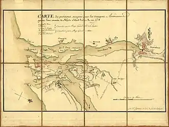 A 1778 French military map showing the positions of generals Lafayette and Sullivan around Narragansett Bay on 30 August.
