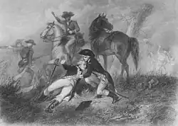 Lafayette first saw combat at the Battle of Brandywine near Chadds Ford, Pennsylvania, on 11 September 1777.[40] British commander Sir William Howe made plans to occupy Philadelphia by moving troops south by ship to Chesapeake Bay rather than approaching the city through the Delaware Bay, which there was a heavy Continental Army presence, and then bringing British troops over land to the city.[41] After the British outflanked the Americans, Washington sent Lafayette to join General John Sullivan. Upon his arrival, Lafayette went with the Third Pennsylvania Brigade, under Brigadier Thomas Conway, and attempted to rally the unit to face the attack. British and Hessian troops continued to advance with their superior numbers, and Lafayette was shot in the leg. During the American retreat, Lafayette rallied the troops, allowing a more orderly pullback, before being treated for his wound.[42] After the battle, Washington cited him for "bravery and military ardour" and recommended him for the command of a division in a letter to Congress, which was hastily evacuating, as the British occupied Philadelphia later that month.[31]