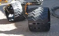 - Mobility systems: Curiosity is equipped with six wheels in a rocker-bogie suspension, which also served as landing gear for the vehicle, unlike its smaller predecessors.[44][45] The wheels are significantly larger (50 centimeters (20 in) diameter) than those used on previous rovers. Each wheel has cleats and is independently actuated and geared, providing for climbing in soft sand and scrambling over rocks. The four corner wheels can be independently steered, allowing the vehicle to turn in place as well as execute arcing turns.[27] Each wheel has a pattern that helps it maintain traction and leaves patterned tracks in the sandy surface of Mars. That pattern is used by on-board cameras to judge the distance traveled. The pattern itself is Morse code for "JPL" (•−−− •−−• •−••).[46] Based on the center of mass, the vehicle can withstand a tilt of at least 50 degrees in any direction without overturning, but automatic sensors will limit the rover from exceeding 30-degree tilts.[27]