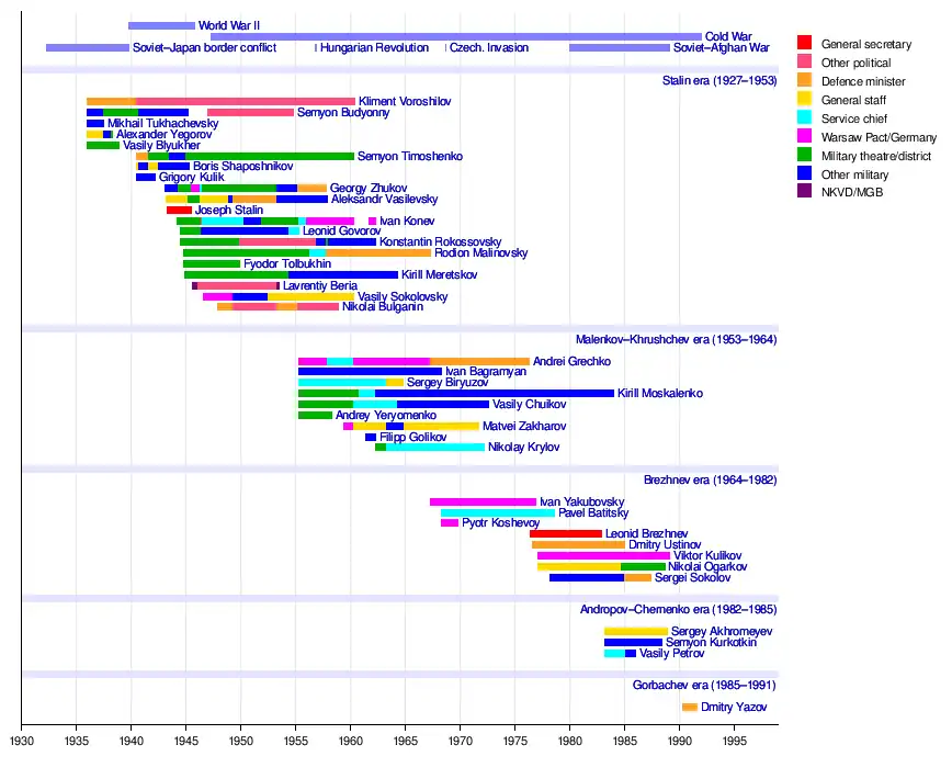 • Those who assumed high command during the Cold War era. All were officers in World War II, but their higher commands were held in the Warsaw Pact or as Soviet defence ministers. These included Sokolovsky, Grechko, Yakubovsky, Kulikov, Ogarkov, Akhromeyev, and Yazov.