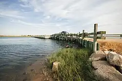The island received international notoriety after the "Chappaquiddick incident" of July 18, 1969, in which Mary Jo Kopechne was killed in a car driven off the Dike Bridge by U.S. Senator Edward "Ted" Kennedy. The bridge crossed Poucha Pond on Chappaquiddick Island (a smaller island formerly connected to the Vineyard and part of Edgartown). The bridge was intended for people on foot and bicycles, as well as the occasional emergency vehicle when conditions warranted. Currently, 4×4 vehicles with passes are allowed to cross the reconstructed bridge.[36]