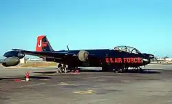 In addition, hydraulically-operated triangular air brakes were installed on the rear fuselage, which worked in addition to the existing 'finger'-type brakes installed in the wings; the new brakes gave the pilots a greater level of controllability, improving the accuracy of low-level bombing runs.[9] The B-57B was equipped with an APW-11 Bombing Air Radar Guidance System for target approach guidance, as well as an APS-54 radar warning receiver.[11] The engines were also furnished with a new cartridge starting system, eliminating the reliance on ground start carts.[11]