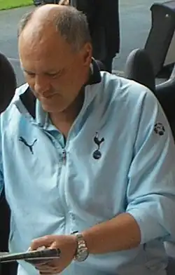 RKC Waalwijk denied reports in June 2004 that Jol was about to become assistant manager of Tottenham Hotspur.[5] Several days later, however, Jol was given the job under Tottenham's new coach, Jacques Santini, having been recruited by Tottenham's sporting director Frank Arnesen.[6] Santini resigned from the manager's job after just 13 games, and on 8 November 2004, Jol was confirmed as his replacement.[7] In his first season in charge, Jol improved their league fortunes and scrapped the defensive nature of play that Santini had instilled. After winning five league games in a row, Tottenham's best run of form since the 1992–1993 season, he won the FA Manager of the Month award in December 2004 and was strongly linked in the press with the then vacant managerial job at Ajax of Amsterdam. Jol, however, ruled out moving clubs early. Jol led Tottenham to the verge of European qualification but the season ended with a ninth-place finish in the Premier League after a final day draw at home to Blackburn Rovers. This meant Spurs missed out on the UEFA Cup spot by two points. In August 2005, he signed a new three-year contract with Tottenham.[8]