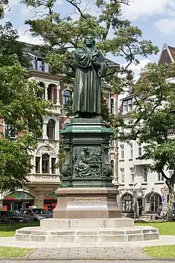 Luther Monument in Worms, a statue of Luther surrounded by the figures of his lay protectors and earlier Church reformers, including John Wycliffe, Jan Hus, and Girolamo Savonarola