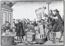 The Catholic sale of indulgences shown in A Question to a Mintmaker, a woodcut by Jörg Breu the Elder of Augsburg, c. 1530