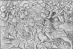 In January 1519, at Altenburg in Saxony, the papal nuncio Karl von Miltitz adopted a more conciliatory approach. Luther made certain concessions to the Saxon, who was a relative of the Elector, and promised to remain silent if his opponents did.[78] The theologian Johann Eck, however, was determined to expose Luther's doctrine in a public forum. In June and July 1519, he staged a disputation with Luther's colleague Andreas Karlstadt at Leipzig and invited Luther to speak.[79] Luther's boldest assertion in the debate was that popes do not have the exclusive right to interpret scripture, and that therefore neither popes nor church councils were infallible.[80] For this, Eck branded Luther a new Jan Hus, referring to the Czech reformer and heretic burned at the stake in 1415. From that moment, he devoted himself to Luther's defeat.[81]