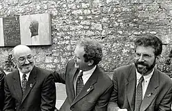 After his release, and another conviction in the Republic of Ireland for IRA membership in 1974,[19] he became increasingly prominent in Sinn Féin, the political wing of the republican movement. He was in indirect contact with British intelligence during the 1981 hunger strikes, and again in the early 1990s.[20] He was elected to the Northern Ireland Assembly at Stormont in 1982, representing Londonderry. He was the second candidate elected after Social Democratic and Labour Party leader John Hume. As with all elected members of Sinn Féin and the SDLP, he did not take up his seat.[21] On 9 December 1982, McGuinness, Gerry Adams and Danny Morrison were banned from entering Great Britain under the Prevention of Terrorism Act by the Home Secretary, William Whitelaw.[22]