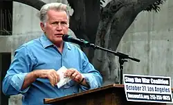 In early 2003, Sheen signed the "Not in My Name" declaration opposing the invasion of Iraq (along with prominent figures such as Noam Chomsky and Susan Sarandon); the declaration appeared in the magazine The Nation. Sheen visited Camp Casey on August 28, 2005, to pray with anti-Iraq War activist Cindy Sheehan, who had demanded a second meeting with U.S. President George W. Bush.[52] Addressing Sheehan's supporters, Sheen said: "At least you've got the acting president of the United States", referring to his role as president Josiah Bartlet on The West Wing.[53]