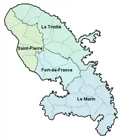 Saint-Pierre is the third subprefecture of the island. It comprises eight communes, lying in the northwest of Martinique. In 2019, the population was 22,344.[52] In addition to Saint-Pierre, its communities include Le Carbet, Case-Pilote-Bellefontaine, Le Morne-Rouge, and Le Prêcheur.