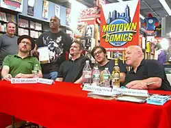Writers of Marvel titles in the 2010s include (seated left to right) Ed Brubaker, Christos Gage, Matt Fraction, and Brian Michael Bendis.