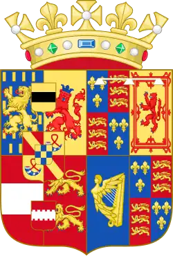 The coat of arms used by William and Mary were: Quarterly, I and IV Grandquarterly, Azure three fleurs-de-lis Or (for France) and Gules three lions passant guardant in pale Or (for England); II Or a lion rampant within a double tressure flory-counter-flory Gules (for Scotland); III Azure a harp Or stringed Argent (for Ireland); overall an escutcheon Azure billetty a lion rampant Or (for the House of Orange-Nassau).